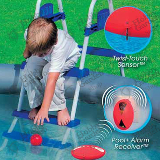 Sistema di allarme per piscina in due pezzi: posizionato nella piscina, l’allarme di superficie rileva eventuali spostamenti d’acqua e invia il segnale al ricevitore che attiva una sirena ad alta frequenza.