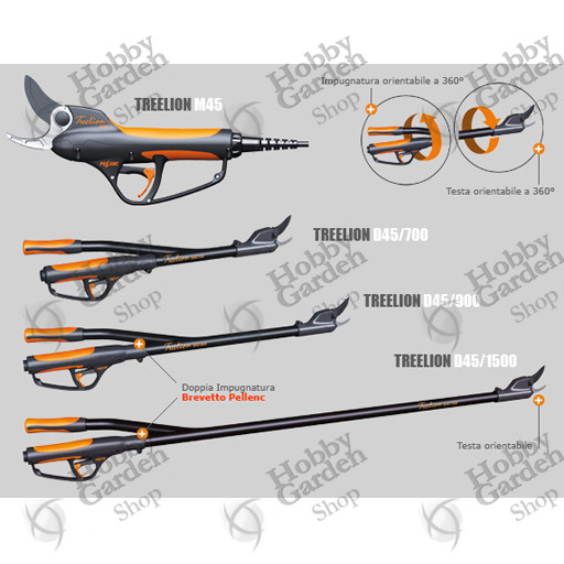 Il sistema a doppio grilletto Brevetto Pellenc consente di passare, con una singola pressione, da un’apertura intermedia a un’apertura totale per garantire sempre rapidità e semplicità d’uso. Questa gamma di forbici è commercializzata di serie con la batteria 200 o con un kit di collegamento a un’altra batteria della gamma Ultra Lithium Battery. Treelion è disponibile in varie versioni: un modello a una mano di tipo classico e numerosi modelli a due mani e con asta per lavorare in aree a densa vegetazione o a distanza.