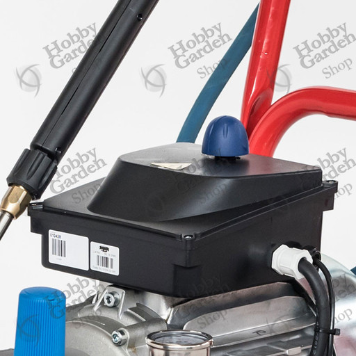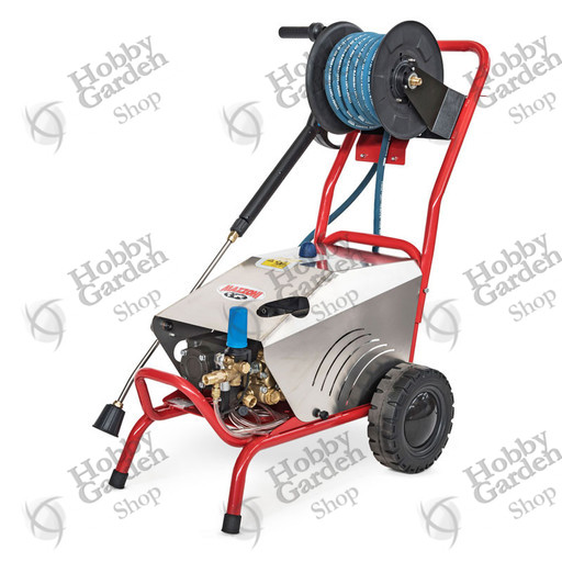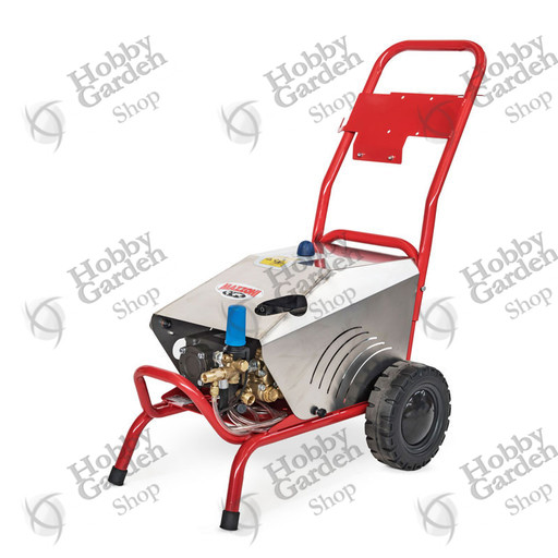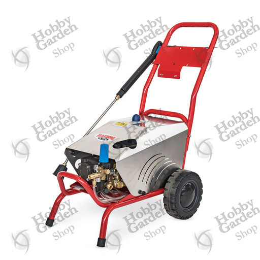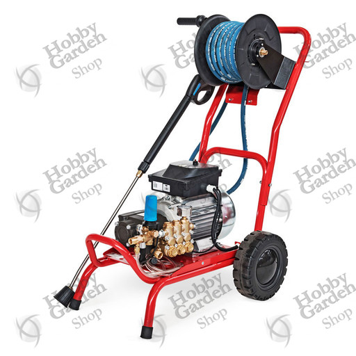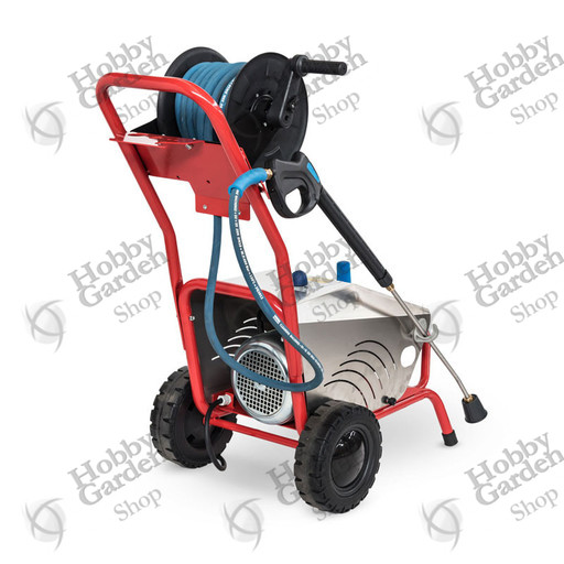 Solido telaio in acciaio verniciato, con ruote di grande diametro e predisposizione per applicazione di avvolgitubo fino a 30 mt.