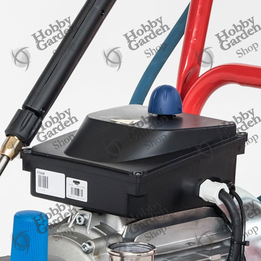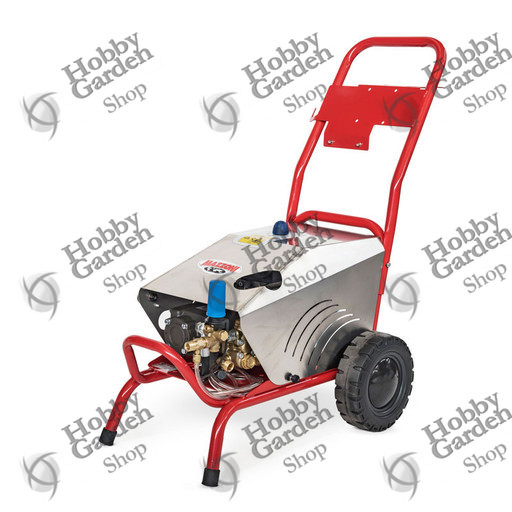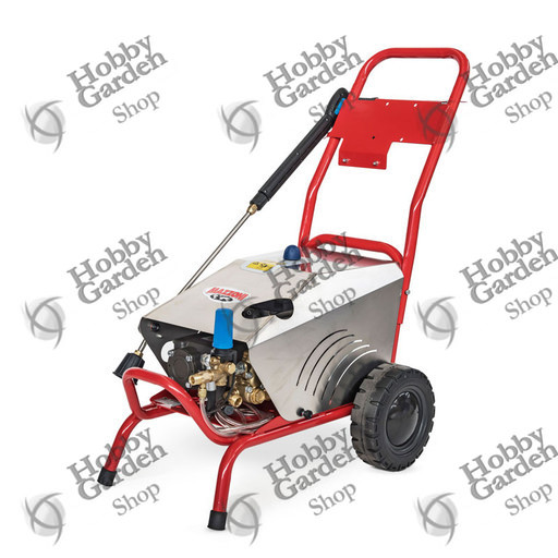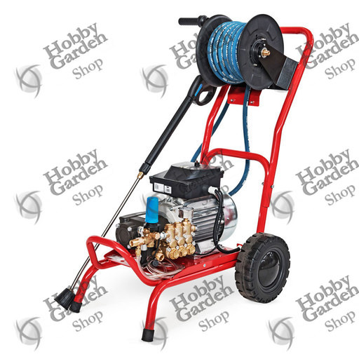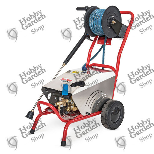 Solido telaio in acciaio verniciato, con ruote di grande diametro e predisposizione per applicazione di avvolgitubo fino a 30 mt.