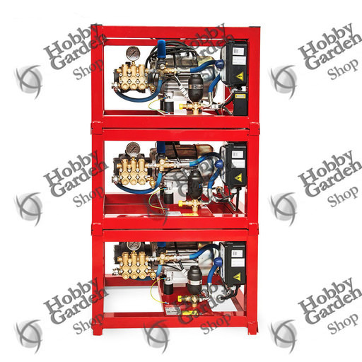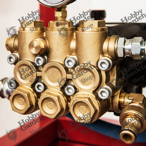 Pompa Mazzoni professionale in linea (a bielle) con testata in ottone e tre pistoni in ceramica. (a richiesta pompa Interpump)