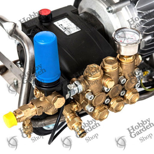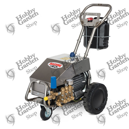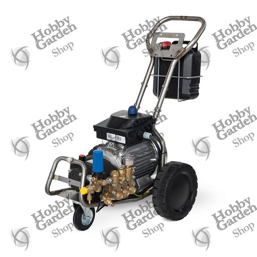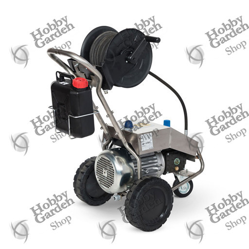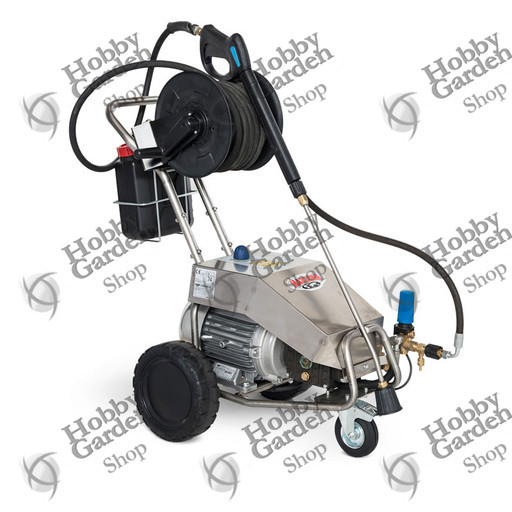Idropulitrice ad acqua fredda, con telaio completamente in acciaio INOX fissato su 2 ruote pneumatiche più 1 girevole.