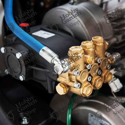 Pompa professionale Mazzoni in linea (a bielle) con testata in ottone e tre pistoni in ceramica. ( a richiesta pompa Interpump)