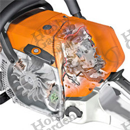 In questo modo la motosega assicura sempre prestazioni del motore ottimali. Non sono più necessarie regolazioni manuali. Dotata di altre pratiche caratteristiche di serie, come il filtro aria di lunga durata con filtro HD2, facile da pulire, il sistema antivibrante professionale Stihl, la pompa olio a portata regolabile, i dati antismarrimento sul coperchio del rocchetto, il coperchio monopezzo con tre giunti a innesto rapido e la funzione di memoria per consentire una rapida ripresa del lavoro dopo le pause.