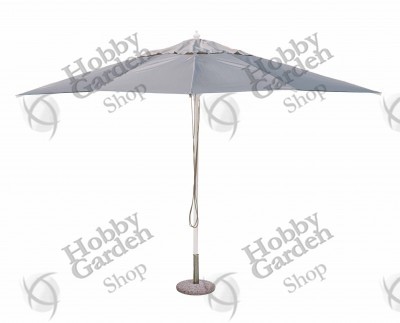 struttura alluminio verniciata bianca. Palo diam 48 mm, 8 stecche 20×30. telo con inserti in pelle,in polyestere 270gr/m2 idrorepellente colore grigio. Mis 3×3 m
