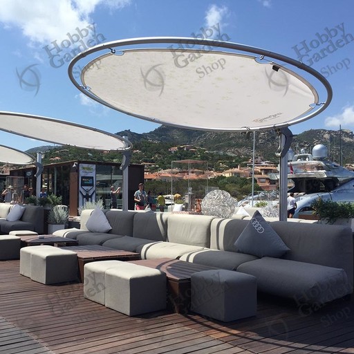 I colori disponibili, sobri e raffinati ma decisi, potenziano ancora di più questa vera e propria esperienza visiva. L’anello, regolabile agevolmente in altezza, può anche essere posizionato molto in basso, per adeguarsi al sole o al livello di ombra desiderato.