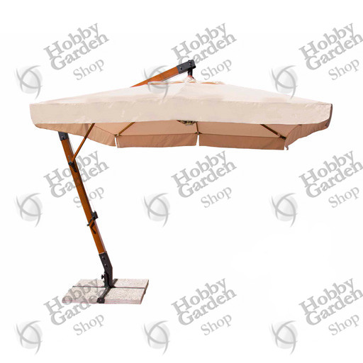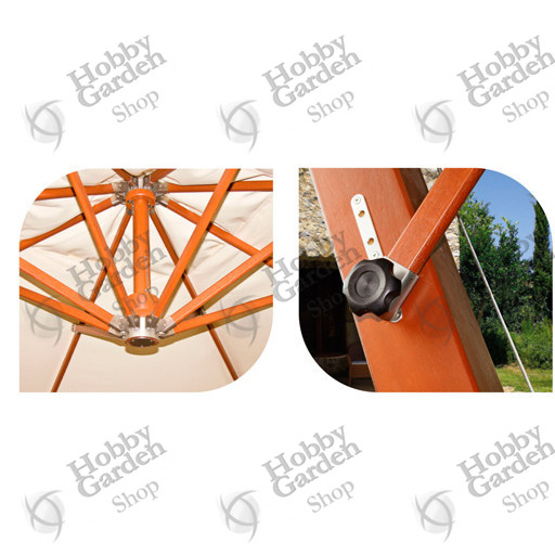 Ombrellone a Braccio con struttura in legno indonesiano. Palo 93×93mm, otto stecche 20×35mm intercambiabili con finali in alluminio e inserti in pelle.