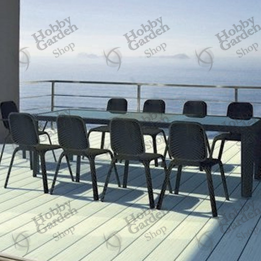 Il rivestimento è in fibra Tal-wicker. Vetro temperato. Piedini in alluminio.