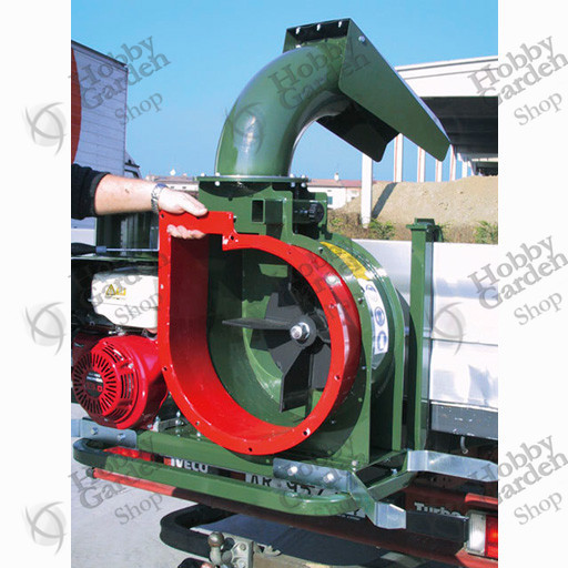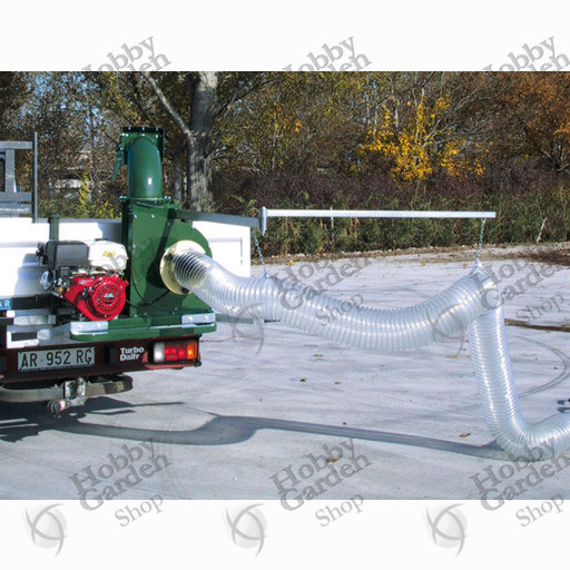 L’aspirafoglie è dotato di un tubo flessibile del diametro di 200 mm e lungo 6 metri che coniuga un’alta resistenza all’usura con un basso peso per consentire una buona maneggevolezza senza compromettere l’affidabilità. L’aspirazione avviene mediante una ventola del diametro di 390 mm con 3, 4 o pale pale mosse da un motore a benzina rispettivamente di Hp 9/13/20 o dalla presa di forza del trattore in versione con attacco a tre punti. La parte interna soggetta ad usura ed abrasione è completamente sostituibile in modo molto semplice e veloce, evitando il danneggiamento del corpo macchina.